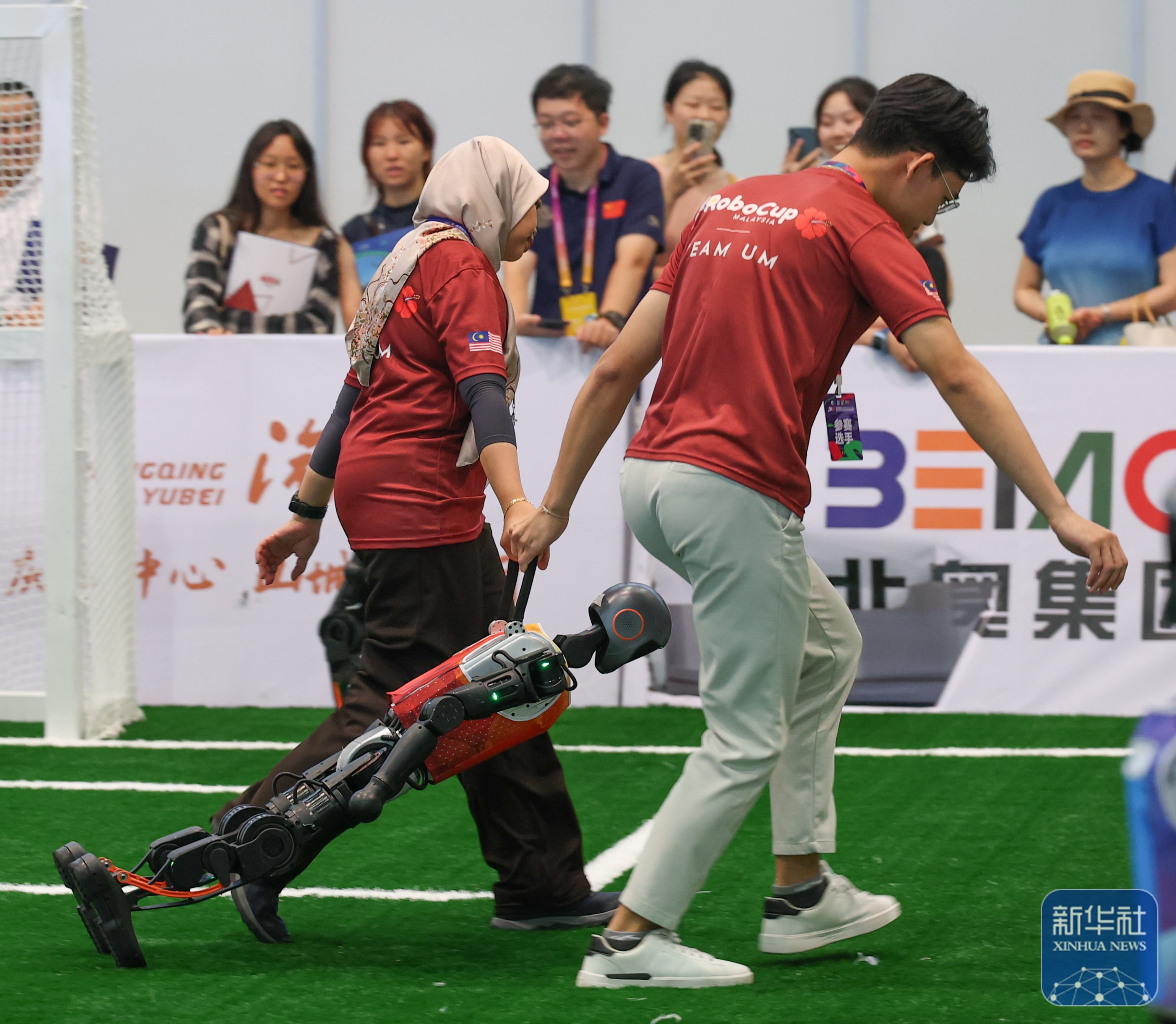 ↑ 9月5日,在机器人3V3足球赛中,工作人员将故障机器人抬出场外。