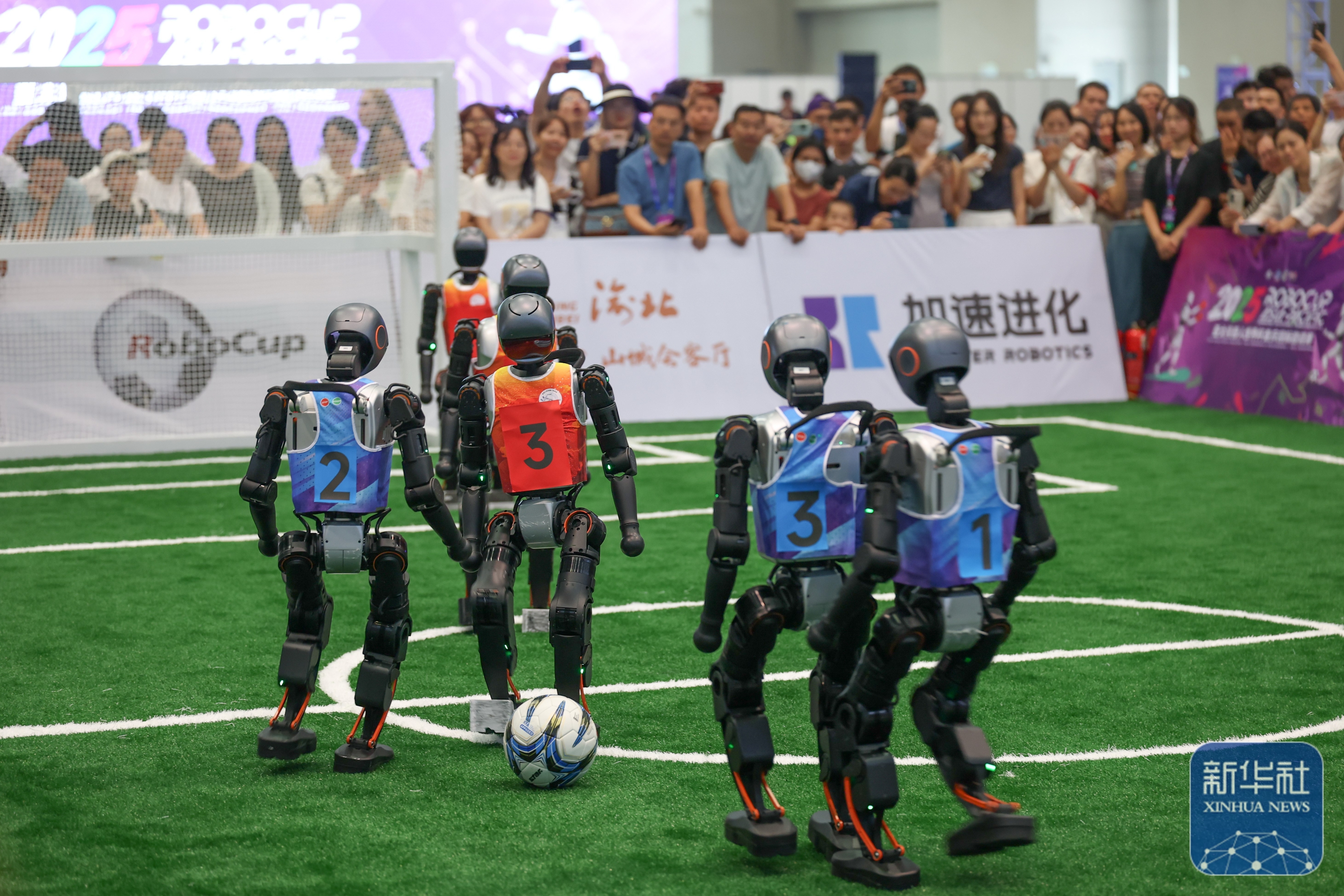 ↑ 这是9月5日在2025世界智能产业博览会拍摄的机器人3V3足球赛。