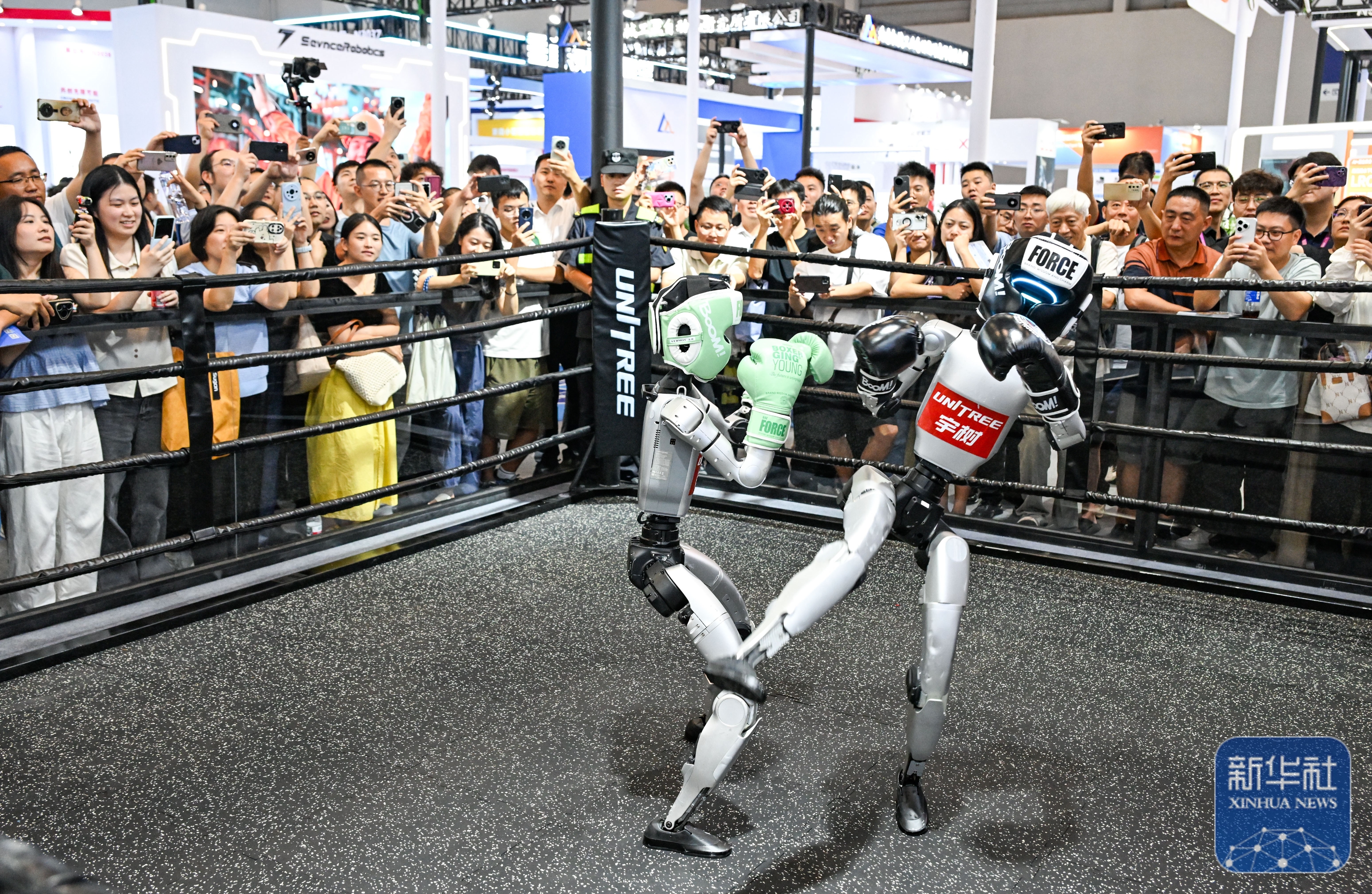 ↑ 这是9月5日在2025世界智能产业博览会宇树科技展厅拍摄的机器人拳击赛现场。