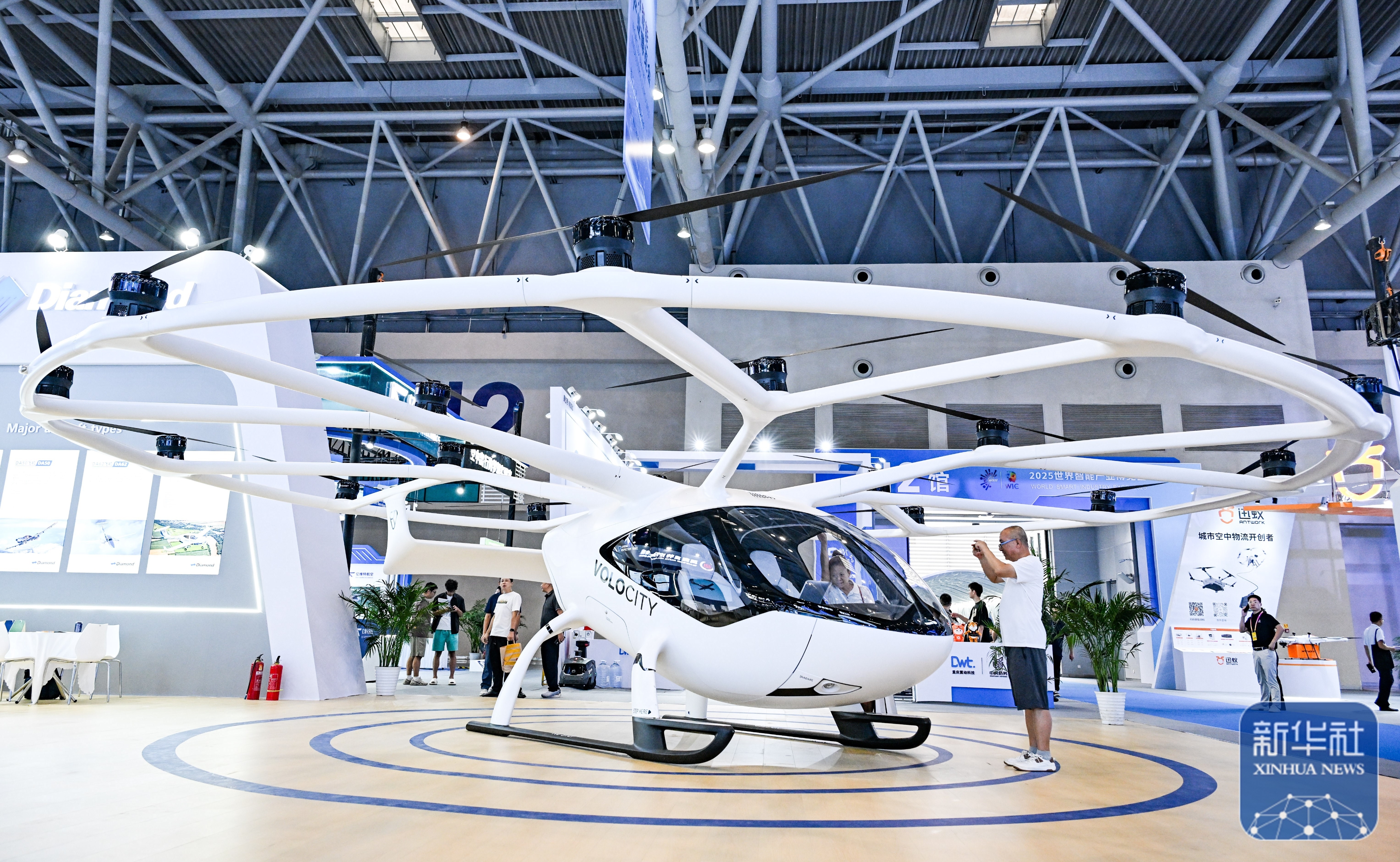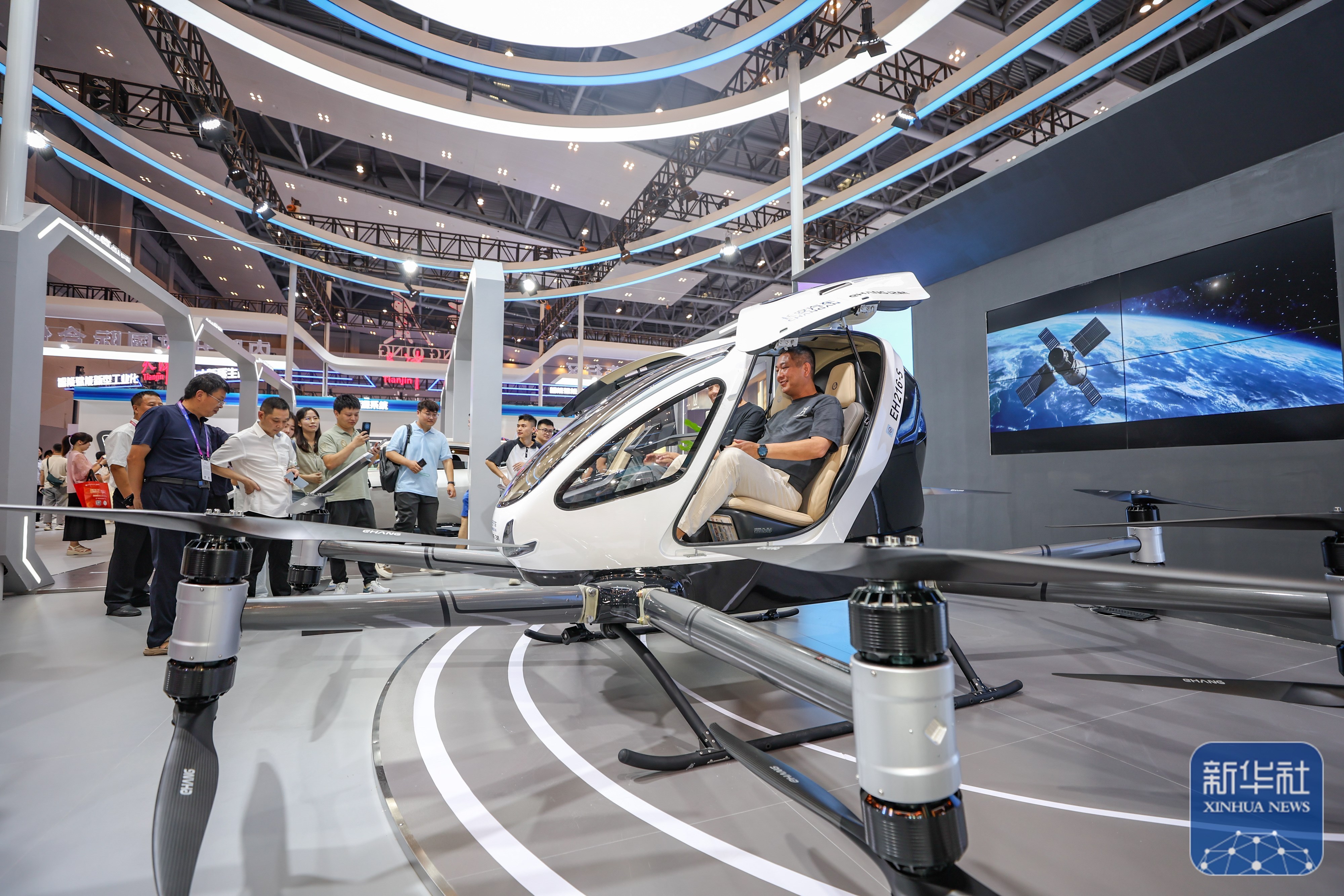 ↑ 9月5日,观众在2025世界智能产业博览会现场体验载人飞行器。