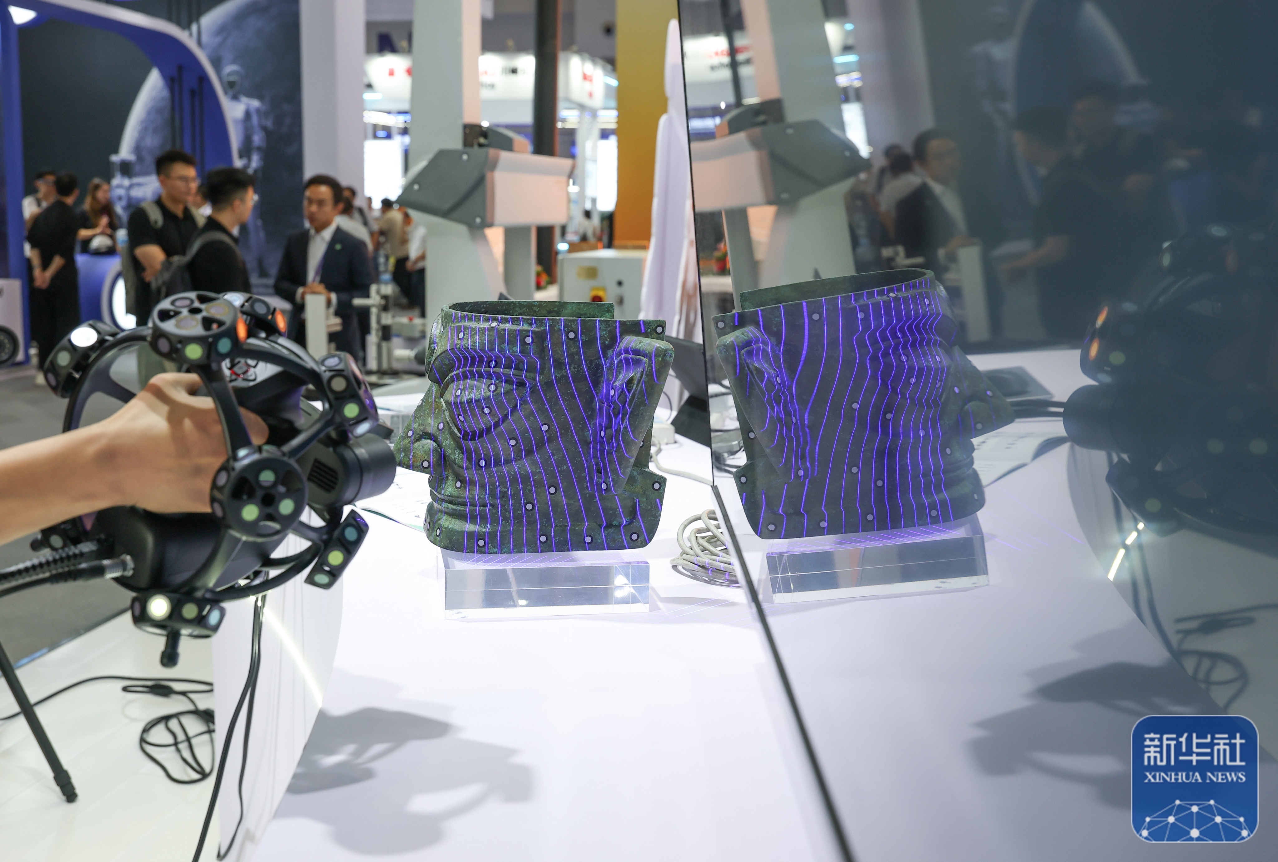 ↑ 9月5日,工作人员在2025世界智能产业博览会上演示跟踪式三维扫描仪。