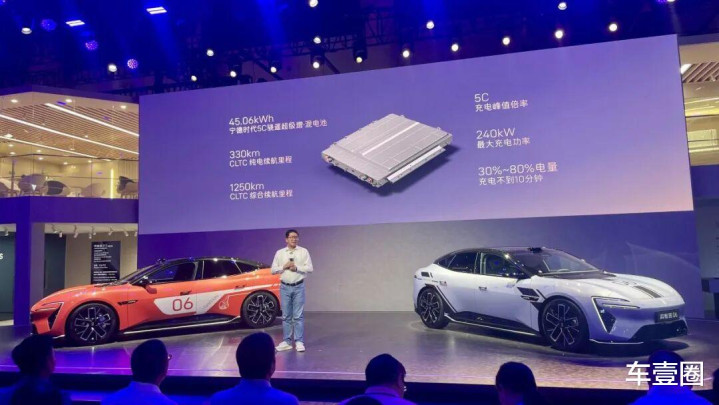 为满足消费者的多元化需求,阿维塔06 Ultra增程版配备了容量45.06kWh的宁德时代5C骁遥超级增·混电池,CLTC纯电续航达330km,CLTC综合续航里程更可达到1250km,极大缓解了“续航焦虑”;同时,5C充电峰值倍率则让30%~80%电量之补能时间不到10分钟。